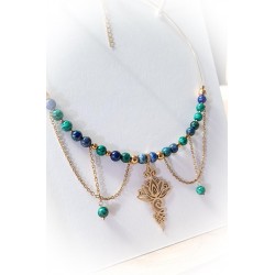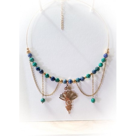 Ce collier déesse mêle la douceur bleue de la Chrysocolle à la profondeur verte de la Malachite, deux pierres sacrées liées à la guérison émotionnelle et à l'ouverture du cœur.